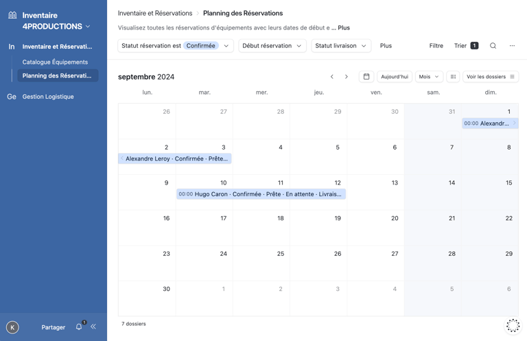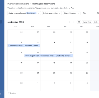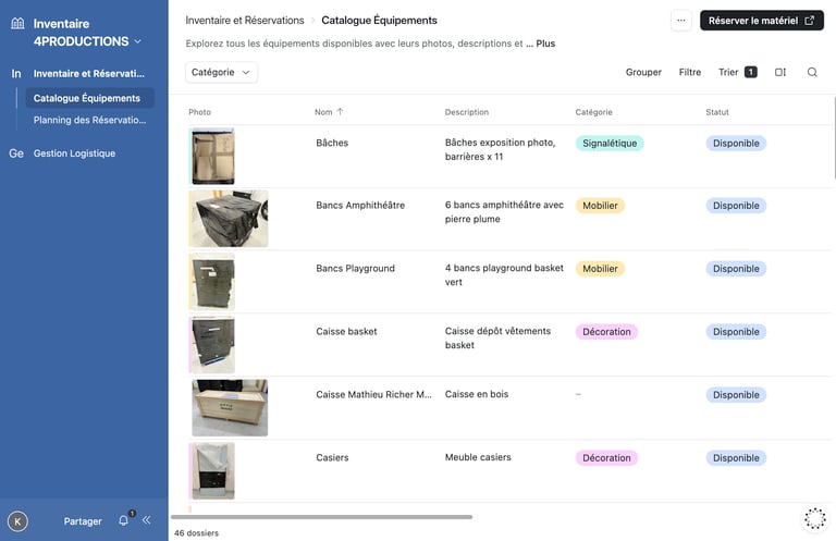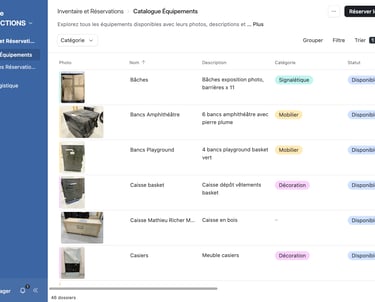Chaque objet est identifié, suivi et historisé sur votre plateforme web. Vous savez précisément ce que vous possédez, où il se trouve, dans quel état il est. Faites vos réservation depuis la plateforme et oubliez les tableaux Excel.